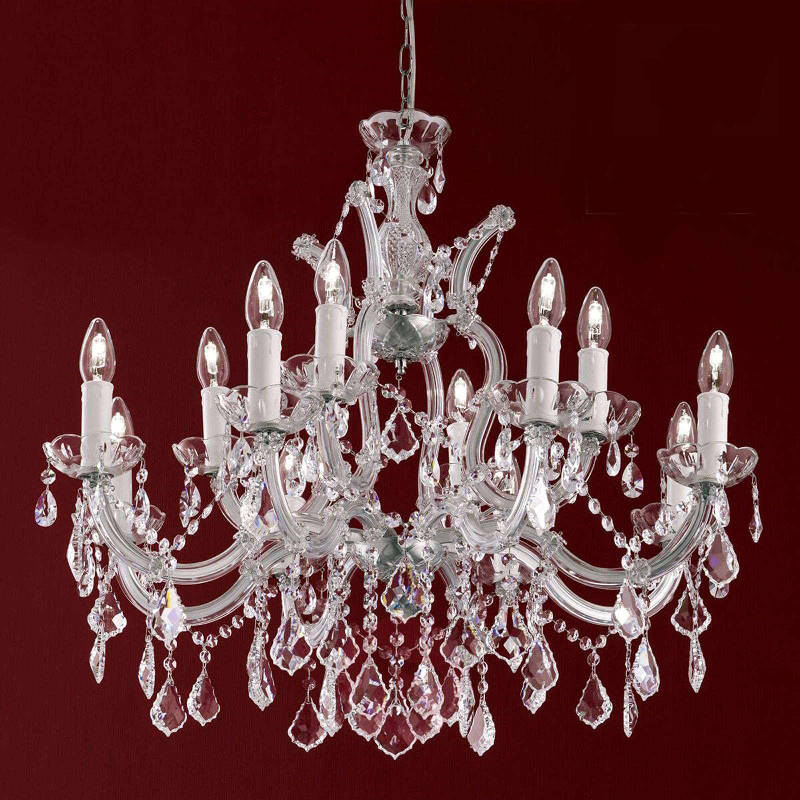 Tradycyjny żyrandol kryształowy Maria Teresa, wyprodukowany w Austrii Wzornictwo dworskie z XVIII wieku w połączeniu z jakością wykonania w Austrii to cechy wyróżniające ten żyrandol Maria Teresa, który nie bez powodu nosi nazwę będącą imieniem słynnej cesarzowej z rodu Habsburgów. Maria Teresa miała znaczący wpływ na swoją epokę i na wygląd Europy nie tylko od strony politycznej, lecz także tam, gdzie mamy do czynienia z architekturą. Na letnią rezydencję cesarską wybrała Pałac Schönbrunn i wprowadziła decydujące zmiany architektoniczne. Inspiracją dla modelu Maria Teresa, wykonanego przez austriackiego producenta opraw oświetleniowych, który prowadzi w Austrii ręczną produkcję swoich okazałych, najwyższej klasy lamp, była aranżacja wnętrz, a zwłaszcza wygląd żyrandoli z epoki. Podstawowa konstrukcja tego dwupiętrowego żyrandola wykonana jest ze stali o błyszczącym srebrnym wykończeniu. Ozdobne ramiona i korona pokryte są przypominającym szkło materiałem o nazwie verdyl. Pełne przepychu zawieszone ozdoby o nostalgicznym wyglądzie wykonano z najcieńszego kryształu Asfour, a płytki pod świecami – z przezroczystego szkła. Klasa efektywności energetycznej: A++